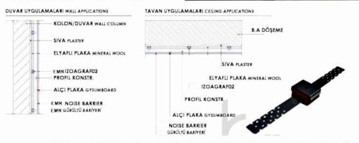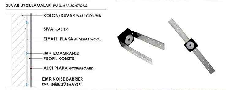 IZOAGRAF-01 ürünleri, özel üretim kauçuk izolatörlerden imal edilmiş, giydirme duvar imalatlarında, duvar taşıyıcı konstrüksiyonları ile diğer yapı elemanlarının doğrudan temasını engellemek için birbirinden ayıran titreşim sönümleyici malzemelerdir. IZOAGRAF-01 şaft duvarları, mekanik oda, konut – ofis gibi mahallerin ses yalıtımlı duvar imalatında kullanılabilir. IZOAGRAF-01 ürünleri, standart olarak 60 x 120 cm akslarında bir adet olmak üzere kullanılır. Her yüzeyde kullanımı oldukça kolay ve ekonomiktir. Galvaniz ve kutu profil konstrüksiyonlarının, brüt beton, gaz beton ve tuğla duvarlara doğrudan tema sını engellemek için kullanılabilir.