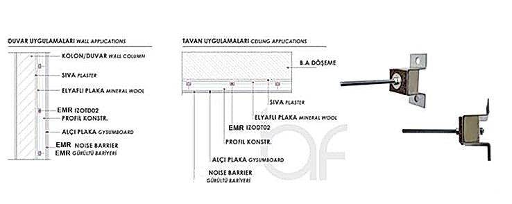 IZODT – 01 ürünleri, tüm yapı elemanları ile uyumlu, gürültü ve titreşim kontrolü sağlayan, özel elastomer izolatörlü duvar ve tavan taşıyıcı elemanlarıdır. İzolasyonlu tavan imalatı ve mekanik askı sistemlerinde, taşıyıcı konstrüksiyon ile döşeme arasında titreşim izolasyonu sağlar. Mekanik odalar, endüstri tesisleri, spor merkezleri, konferans, sinema, tiyatro salonları ile ofis ve konutlarda kullanılabilir. IZODT01 ürünleri, aksi gerektirmedikçe standart olarak 60 x 120cm akslarında bir adet olmak üzere kullanılır. Her yüzeyde kullanımı oldukça kolay ve ekonomiktir. Taşıyıcı konstrüksiyonları, uygulama yapılacak yüzeyden mesafe ayarı yaparak uygulanmasına olanak verdiği için, yüzeyde bulunan eğrilik ve gönyesizliklerin düzeltilmesine olanak verir.